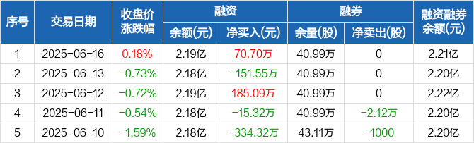 融资方面,当日融资买入381.45万元,融资偿还310.75万元,融资净买入70.7万元。融券方面,融券卖出1.82万股,融券偿还1.82万股,融券余量40.99万股,融券余额223.78万元。融资融券余额合计2.21亿元。