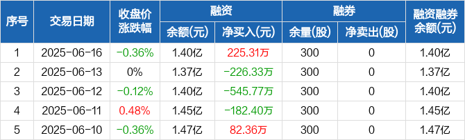 融资方面,当日融资买入346.71万元,融资偿还121.4万元,融资净买入225.31万元。融券方面,融券卖出0股,融券偿还0股,融券余量300股,融券余额2505元。融资融券余额合计1.4亿元。