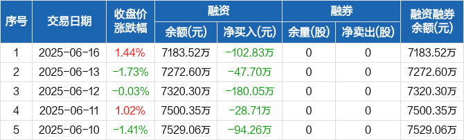 融资方面,当日融资买入165.55万元,融资偿还268.39万元,融资净偿还102.83万元,连续5日净偿还累计453.55万元。融券方面,融券卖出0股,融券偿还0股,融券余量0股,融券余额0元。融资融券余额合计7183.52万元。