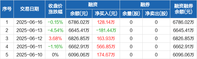 融资方面,当日融资买入692.45万元,融资偿还564.31万元,融资净买入128.14万元。融券方面,融券卖出0股,融券偿还0股,融券余量0股,融券余额0元。融资融券余额合计6786.02万元。