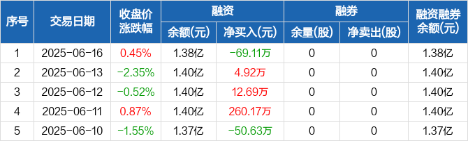融资方面,当日融资买入275.63万元,融资偿还344.74万元,融资净偿还69.11万元。融券方面,融券卖出0股,融券偿还0股,融券余量0股,融券余额0元。融资融券余额合计1.38亿元。
