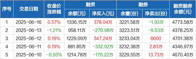 融资方面,当日融资买入493.11万元,融资偿还115.07万元,融资净买入378.04万元。融券方面,融券卖出0份,融券偿还1.93万份,融券余量3221.58万份,融券余额3437.43万元。融资融券余额合计4773.58万元。