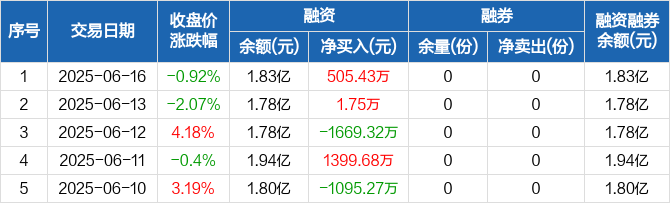 融资方面,当日融资买入1.34亿元,融资偿还1.29亿元,融资净买入505.43万元。融券方面,融券卖出0份,融券偿还0份,融券余量0份,融券余额0元。融资融券余额合计1.83亿元。