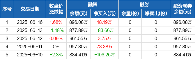 融资方面,当日融资买入260.35万元,融资偿还242.16万元,融资净买入18.19万元。融券方面,融券卖出0份,融券偿还0份,融券余量0份,融券余额0元。融资融券余额合计896.08万元。