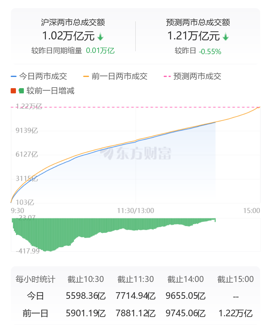 沪深两市成交额连续第14个交易日破万亿,较昨日此时缩量约57.75亿元。
