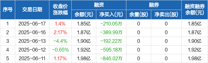 融资方面,当日融资买入425.05万元,融资偿还635.1万元,融资净偿还210.05万元,连续5日净偿还累计2233.47万元。融券方面,融券卖出0股,融券偿还0股,融券余量0股,融券余额0元。融资融券余额合计1.85亿元。
