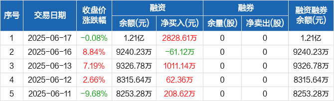 融资方面,当日融资买入6872.8万元,融资偿还4044.19万元,融资净买入2828.61万元。融券方面,融券卖出0股,融券偿还0股,融券余量0股,融券余额0元。融资融券余额合计1.21亿元。