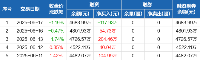 融资方面,当日融资买入87.89万元,融资偿还205.83万元,融资净偿还117.93万元。融券方面,融券卖出0股,融券偿还0股,融券余量0股,融券余额0元。融资融券余额合计4683.99万元。
