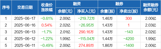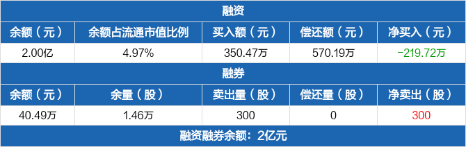 融资方面,当日融资买入350.47万元,融资偿还570.19万元,融资净偿还219.72万元。融券方面,融券卖出300股,融券偿还0股,融券余量1.46万股,融券余额40.49万元。融资融券余额合计2亿元。