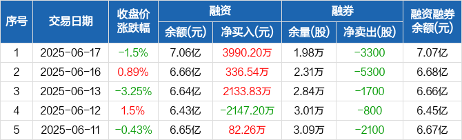 融资方面,当日融资买入5975.01万元,融资偿还1984.82万元,融资净买入3990.2万元,连续3日净买入累计6460.57万元。融券方面,融券卖出100股,融券偿还3400股,融券余量1.98万股,融券余额135.14万元。融资融券余额合计7.07亿元。