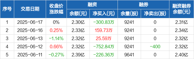 融资方面,当日融资买入346.44万元,融资偿还647.28万元,融资净偿还300.83万元。融券方面,融券卖出0股,融券偿还0股,融券余量9241股,融券余额37.78万元。融资融券余额合计2.31亿元。