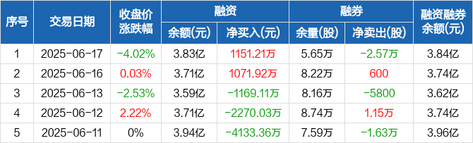 融资方面,当日融资买入5084.92万元,融资偿还3933.7万元,融资净买入1151.21万元。融券方面,融券卖出200股,融券偿还2.59万股,融券余量5.65万股,融券余额175.43万元。融资融券余额合计3.84亿元。