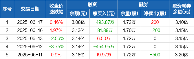 融资方面,当日融资买入708.36万元,融资偿还1202.23万元,融资净偿还493.87万元。融券方面,融券卖出200股,融券偿还0股,融券余量1.72万股,融券余额139.9万元。融资融券余额合计3.1亿元。