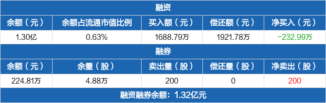 融资方面,当日融资买入1688.79万元,融资偿还1921.78万元,融资净偿还232.99万元。融券方面,融券卖出200股,融券偿还0股,融券余量4.88万股,融券余额224.81万元。融资融券余额合计1.32亿元。