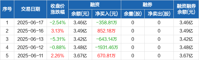融资方面,当日融资买入1369.31万元,融资偿还1728.12万元,融资净偿还358.81万元。融券方面,融券卖出0股,融券偿还0股,融券余量0股,融券余额0元。融资融券余额合计3.46亿元。