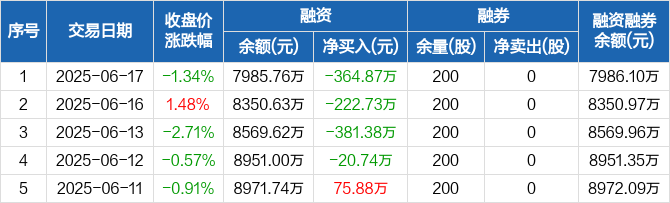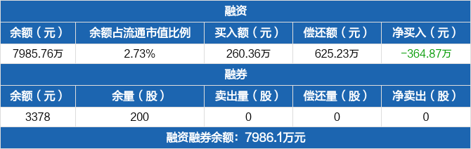 融资方面,当日融资买入260.36万元,融资偿还625.23万元,融资净偿还364.87万元,连续4日净偿还累计989.71万元。融券方面,融券卖出0股,融券偿还0股,融券余量200股,融券余额3378元。融资融券余额合计7986.1万元。