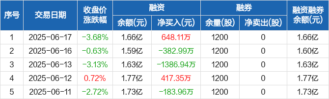 融资方面,当日融资买入1647.74万元,融资偿还999.63万元,融资净买入648.11万元。融券方面,融券卖出0股,融券偿还0股,融券余量1200股,融券余额8.39万元。融资融券余额合计1.66亿元。