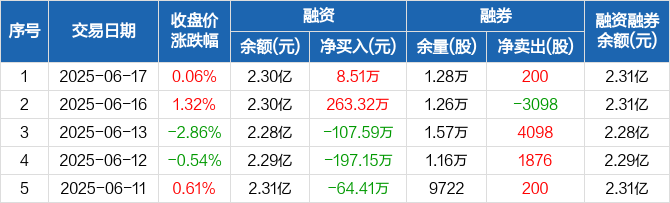 融资方面,当日融资买入185.32万元,融资偿还176.82万元,融资净买入8.51万元。融券方面,融券卖出200股,融券偿还0股,融券余量1.28万股,融券余额20.72万元。融资融券余额合计2.31亿元。