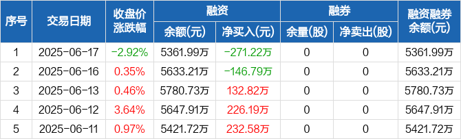 融资方面,当日融资买入68.37万元,融资偿还339.59万元,融资净偿还271.22万元。融券方面,融券卖出0股,融券偿还0股,融券余量0股,融券余额0元。融资融券余额合计5361.99万元。
