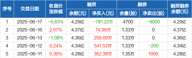 电气风电:融资净偿还781.22万元,融资余额4.29亿元(06-17)