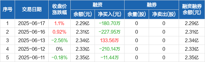 融资方面,当日融资买入206.07万元,融资偿还386.76万元,融资净偿还180.7万元。融券方面,融券卖出0股,融券偿还0股,融券余量0股,融券余额0元。融资融券余额合计2.29亿元。