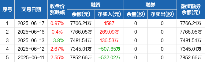 融资方面,当日融资买入212.22万元,融资偿还212.06万元,融资净买入1587元,连续3日净买入累计405.78万元。融券方面,融券卖出0股,融券偿还0股,融券余量0股,融券余额0元。融资融券余额合计7766.21万元。