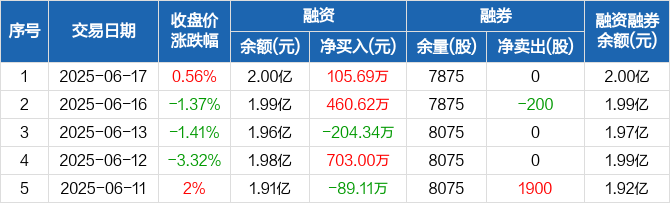 融资方面,当日融资买入696.94万元,融资偿还591.25万元,融资净买入105.69万元。融券方面,融券卖出0股,融券偿还0股,融券余量7875股,融券余额69.42万元。融资融券余额合计2亿元。
