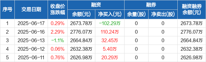 融资方面,当日融资买入77.99万元,融资偿还180.28万元,融资净偿还102.29万元。融券方面,融券卖出0股,融券偿还0股,融券余量0股,融券余额0元。融资融券余额合计2673.78万元。