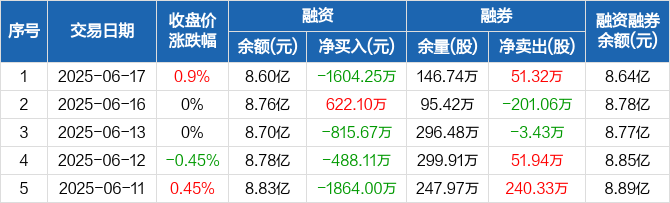 中国能建融资融券信息显示,2025年6月17日融资净偿还1604.25万元;融资余额8.6亿元,较前一日下降1.83%。