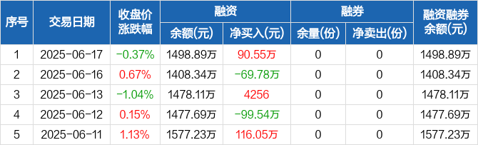融资方面,当日融资买入192.11万元,融资偿还101.56万元,融资净买入90.55万元。融券方面,融券卖出0份,融券偿还0份,融券余量0份,融券余额0元。融资融券余额合计1498.89万元。