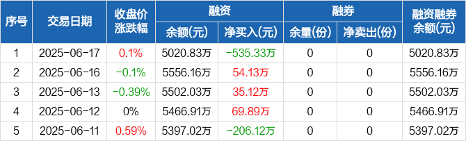 融资方面,当日融资买入188.91万元,融资偿还724.23万元,融资净偿还535.33万元。融券方面,融券卖出0份,融券偿还0份,融券余量0份,融券余额0元。融资融券余额合计5020.83万元。