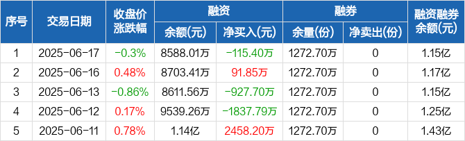 融资方面,当日融资买入722.2万元,融资偿还837.6万元,融资净偿还115.4万元。融券方面,融券卖出0份,融券偿还0份,融券余量1272.7万份,融券余额2942.48万元。融资融券余额合计1.15亿元。