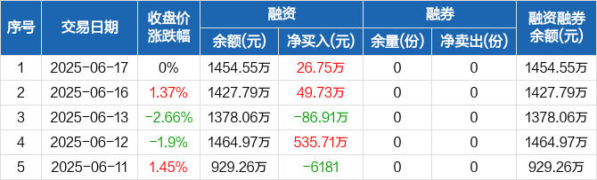 融资方面,当日融资买入286.35万元,融资偿还259.59万元,融资净买入26.75万元。融券方面,融券卖出0份,融券偿还0份,融券余量0份,融券余额0元。融资融券余额合计1454.55万元。