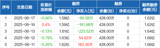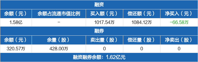 融资方面,当日融资买入1017.54万元,融资偿还1084.12万元,融资净偿还66.58万元,连续3日净偿还累计451.78万元。融券方面,融券卖出0份,融券偿还0份,融券余量428万份,融券余额320.57万元。融资融券余额合计1.62亿元。