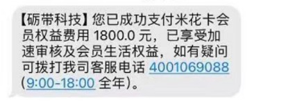 李红收到的提示短信同样显示,“权益服务由深圳市齐为信息科技有限公司提供。”黄利民收到的“米花卡会员权益费成功支付”短信则来自砺带科技。