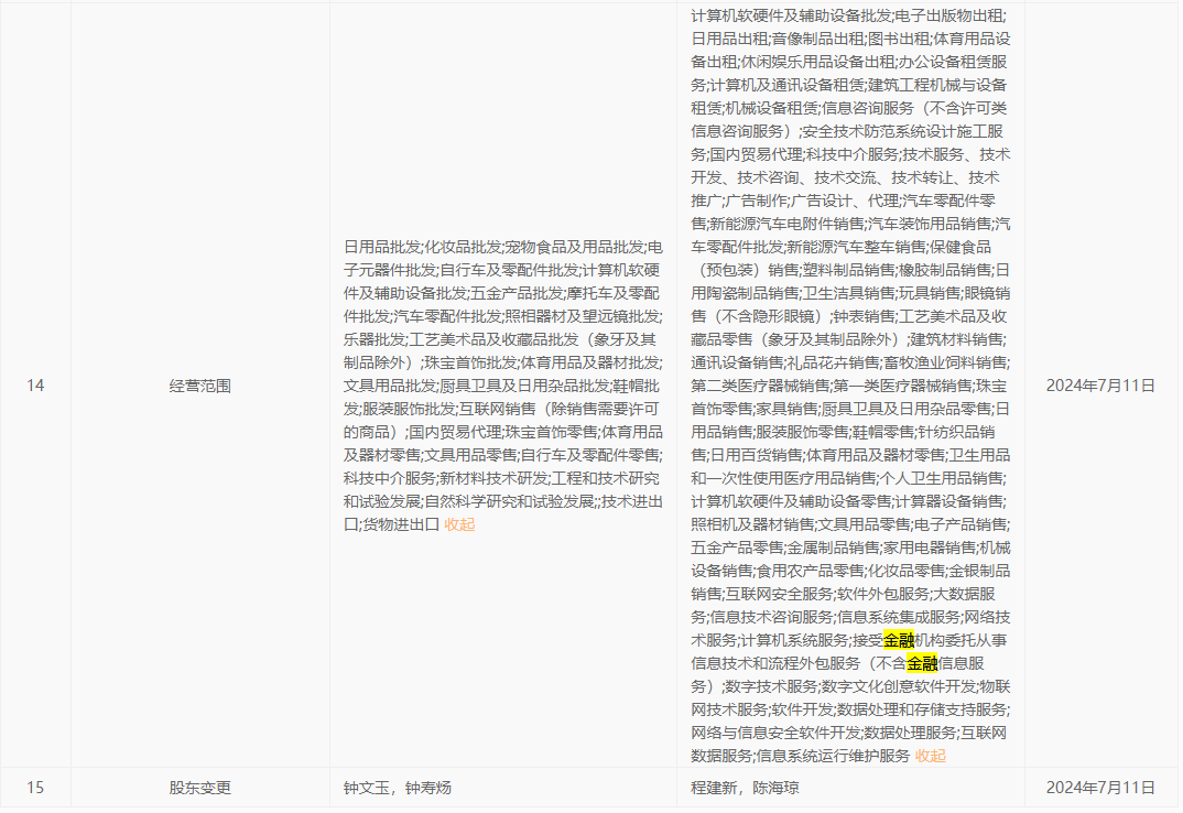 工商信息显示,广州紫多米科技有限公司曾于2024年7月发生经营范围变更,新增加了接受金融机构委托从事信息技术和流程外包服务(不含金融信息服务),当月,该公司股东发生变更,转由程建新、陈海琼持股,名称也从“广州市莱迪科技有限公司”更名为“广州紫多米科技有限公司”。