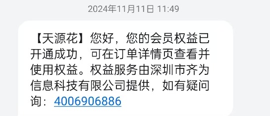 会员费被谁扣了?根据林泽提供的扣款短信,会员费的扣款商户是齐为信息科技。林泽在天源花借贷提现到账的当天,就收到了一条会员权益开通成功的短信,短信显示,“权益服务由深圳市齐为信息科技有限公司提供。”