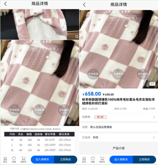 商城中一件无品牌毛衣售价658元。天源花App截图