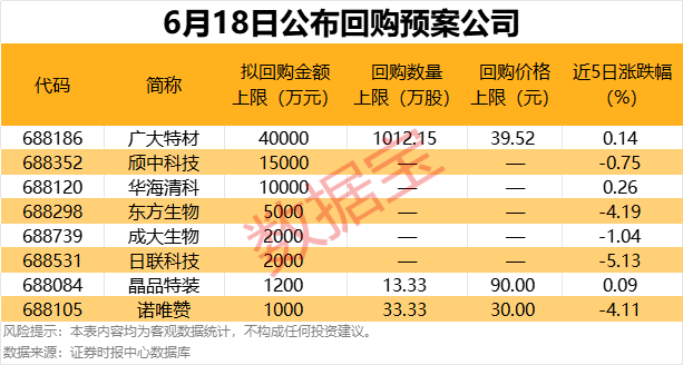 6月18日8家科创板公司披露回购计划,多数为公司董事长、实控人或总经理等提议回购,按拟回购金额上限统计,广大特材、颀中科技、华海清科拟回购金额上限超亿元。