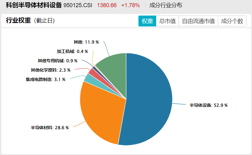 按照中证四级行业划分,半导体设备行业的权重占比超过50%,半导体材料行业的占比超过28%。