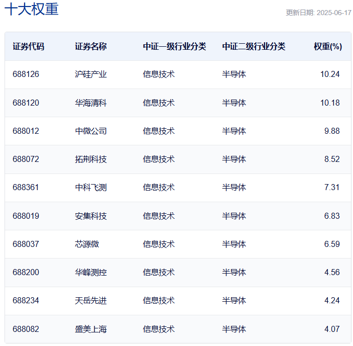 上证科创板半导体材料设备主题指数前十大权重的累计占比为72.42%,其中沪硅产业、华海清科、中微公司、拓荆科技的占比超过8%。