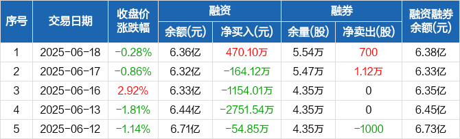 融资方面,当日融资买入2359.56万元,融资偿还1889.46万元,融资净买入470.1万元。融券方面,融券卖出700股,融券偿还0股,融券余量5.54万股,融券余额177.93万元。融资融券余额合计6.38亿元。