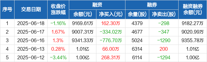 融资方面,当日融资买入715.42万元,融资偿还553.13万元,融资净买入162.3万元。融券方面,融券卖出0股,融券偿还298股,融券余量4379股,融券余额12.66万元。融资融券余额合计9182.27万元。