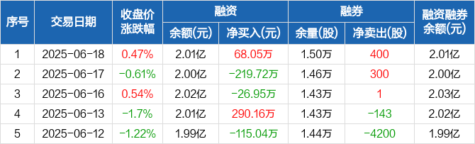 融资方面,当日融资买入385.2万元,融资偿还317.15万元,融资净买入68.05万元。融券方面,融券卖出400股,融券偿还0股,融券余量1.5万股,融券余额41.79万元。融资融券余额合计2.01亿元。