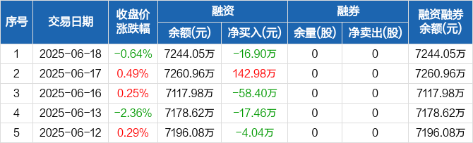融资方面,当日融资买入381.85万元,融资偿还398.75万元,融资净偿还16.9万元。融券方面,融券卖出0股,融券偿还0股,融券余量0股,融券余额0元。融资融券余额合计7244.05万元。
