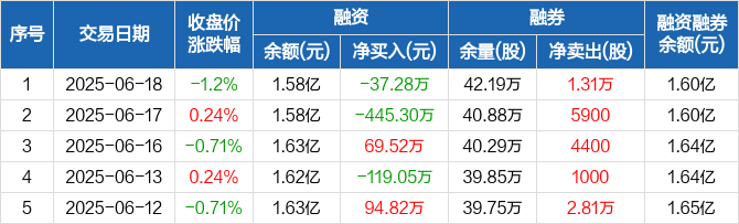 融资方面,当日融资买入387.86万元,融资偿还425.14万元,融资净偿还37.28万元。融券方面,融券卖出1.32万股,融券偿还100股,融券余量42.19万股,融券余额174.24万元。融资融券余额合计1.6亿元。