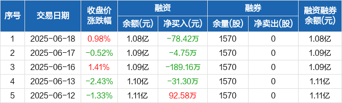 融资方面,当日融资买入114.9万元,融资偿还193.32万元,融资净偿还78.42万元,连续4日净偿还累计303.63万元。融券方面,融券卖出0股,融券偿还0股,融券余量1570股,融券余额4.88万元。融资融券余额合计1.08亿元。