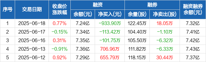 融资方面,当日融资买入1492.25万元,融资偿还2426.15万元,融资净偿还933.9万元,连续3日净偿还累计1149.07万元。融券方面,融券卖出21.76万股,融券偿还3.71万股,融券余量122.45万股,融券余额803.27万元。融资融券余额合计7.32亿元。