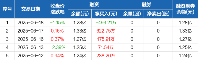 融资方面,当日融资买入198.98万元,融资偿还692.19万元,融资净偿还493.21万元。融券方面,融券卖出0股,融券偿还0股,融券余量0股,融券余额0元。融资融券余额合计1.28亿元。