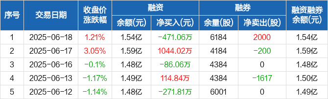 融资方面,当日融资买入833.62万元,融资偿还1304.68万元,融资净偿还471.06万元。融券方面,融券卖出2000股,融券偿还0股,融券余量6184股,融券余额40.42万元。融资融券余额合计1.54亿元。